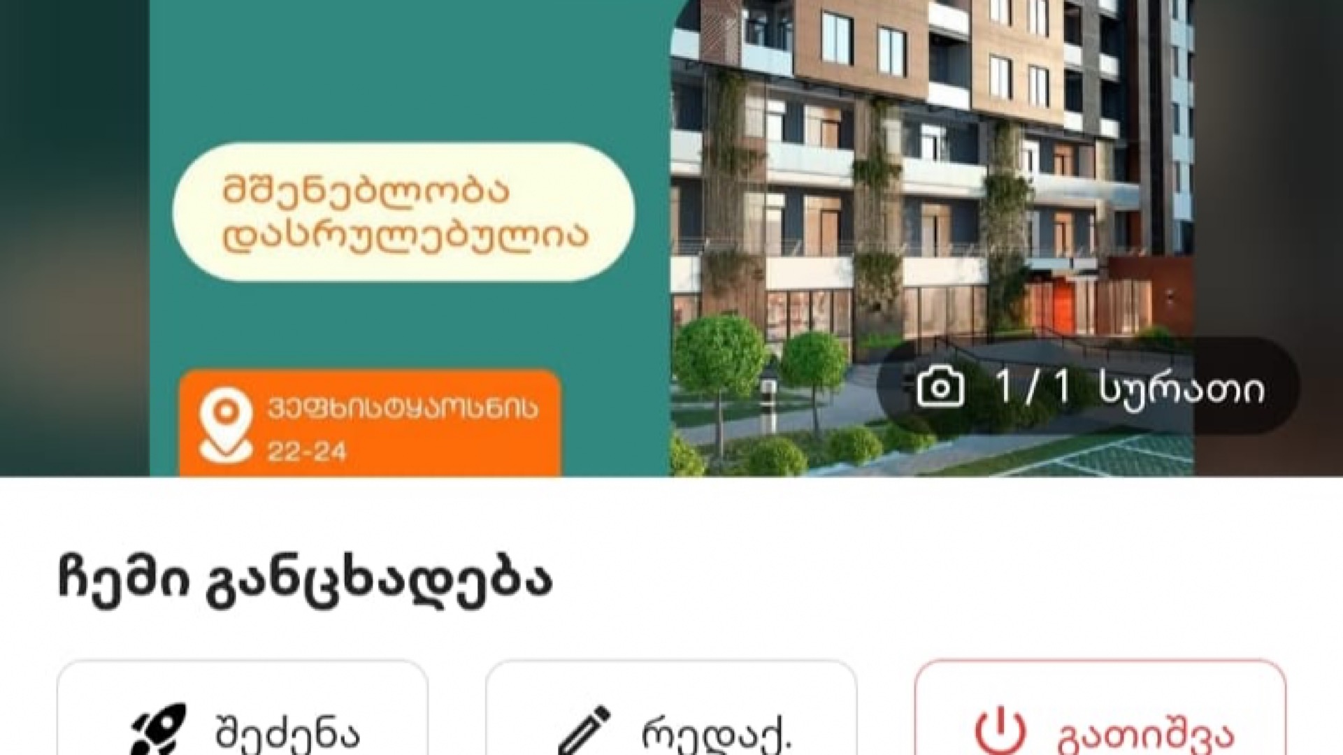 იყიდება ბინა სტუდიოს ტიპის 1 ოთახიანი. დიდი დიღმის საუკეთესო ადგილას, გუდვილთან ვეფხისტყაოსნის ქუჩაზე. მწვანე კარკასი. კორპუსის მშენებლობა დასრულებულია. გადახდილია გამრიცხველიანების თანხა. მობ: 555905555